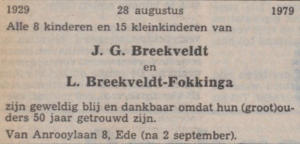 1WillemFrederikGeorgeBreekveldtisgeborenop26september1839inWageningen,zoonvanJanBreekveldtenGijsje Elsenaar.Willemisoverledenop20mei1905inAalten,65jaaroud;notitiebijWillem:vernoemdnaarKoningWillemII. Willemtrouwde,24jaaroud,op11november1863inWinterswijkmetGarritdinaOonk,27jaaroud.Garritdinaisgeboren op18december1835inBorculo,dochtervanGarritJanOonkenJannaHaitink.Garritdinaisoverledenop23maart1915in Aalten, 79 jaar oud. Kinderen van Willem en Garritdina:1.1.JohannesGerhardusBreekveldtisgeborenop18april1864inAalten,zoonvanWillemFrederikGeorge Breekveldt(1)enGarritdinaOonk.Johannesisoverledenop8maart1942inAalten,77jaaroud.Johannestrouwde,29 jaaroud,op2juni1893inAlmelometJohannaAleidaMokkelencate,32jaaroud..Johannaisgeborenop2juni1861 inStadAlmelo,dochtervanJohannesMokkelencateenGrietjeAnnaMokkelencate.Johannaisoverledenop7 augustus 1940 in Aalten, 79 jaar oud. Kinderen van Johannes en Johanna:1.1.1.JohannesBreekveldtisgeborenop23mei1894inAalten,zoonvanJohannesGerhardusBreekveldt(1.1) enJohannaAleidaMokkelencate.Johannesisoverledenop15maart1980inEde,85jaaroud.Johannestrouwde, 29jaaroud,op16augustus1923inTielmetHendrikaCorneliavanGelderen,25jaaroud.Hendrikaisgeborenop23juni1898 in Tiel. Hendrika is overleden op 31 maart 1976 in Ede, 77 jaar oud. Kinderen van Johannes en Hendrika:1.1.1.1.JohannaAleidaBreekveldt,geborenop20december1926.Johannaisoverledenop20februari1987in’s-Gravenhage, 60 jaar oud. 1.1.1.2. Willem Hendrik Breekveldt, geboren in september 1930 in Benschop. Willem is overleden. 1.1.1.3. Jan Gerhardus Breekveldt, geboren na 1930 in Benschop. Jan is overleden. 1.1.1.4. Johannes Breekveldt, geboren na 1931 in Benschop. Johannes is overleden. 1.1.2.WillemFrederikGeorgeBreekveldtisgeborenop23mei1894inAalten,zoonvanJohannesGerhardusBreekveldt(1.1) enJohannaAleidaMokkelencate.Willemisoverledenop12maart1986inEde,91jaaroud.Willemtrouwde,28jaaroud,op8augustus1922inAaltenmetBarberaAnnaStaal,23 jaar oud. Barbera is geboren op 18 november 1898 in Aalten, dochter van Johannes Staal en Krijntje Kapteijn. Barbera is overleden op 23 november 1996 in Ede, 98 jaar oud. Kinderen van Willem en Barbera:1.1.2.1. Johanna Aleida Breekveldt, geboren op 7 januari 1927 in Apeldoorn. Johanna is overleden op 11 januari 1982 in Hilversum, 55 jaar oud. Johanna bleef ongehuwd.1.1.2.2. Johannes Breekveldt, geboren in november 1928 in Oosterhesselen.1.1.2.3.GerdaElizabethBreekveldtisgeborenop23april1932inRijsoord,dochtervanWillemFrederikGeorgeBreekveldt(1.1.2)enBarberaAnnaStaal.Gerdaisoverledenop 4mei1971inRotterdam,39jaaroud.Zijisbegravenop7mei1971inBarendrecht.Gerdatrouwde,28jaaroud,op15oktober1960metHuibertAlblas,28jaaroud.Huibertis geborenop19augustus1932inRijsoord,zoonvanPieterAlblasenJacobaStolk.Huibertisoverledenop15november2016inHaren,84jaaroud.Hijisbegravenop21 november 2016 in Haren. Kinderen van Gerda en Huibert:1.1.2.3.1. Peter Alblas.1.1.2.3.2. Anneke Alblas.1.1.2.3.3. Wilfred Alblas.1.1.2.4. Willem Frederik George Breekveldt, geboren op 21 juli 1935 in Rijsoord. Willem is overleden in oktober 1990 in Ede, 55 jaar oud. 1.1.2.5.PaulTheodoor(Tobias)Breekveldtisgeborenop7april1940inRijsoord,zoonvanWillemFrederikGeorgeBreekveldt(1.1.2)enBarbera Anna Staal. Tobias is overleden op 18 februari 2023 in Wageningen, 82 jaar oud. Tobias trouwde met Loes Sjerp. Kinderen van Tobias en Loes:1.1.2.5.1. Joris Breekveldt.1.1.2.5.2. Jeroen Breekveldt.1.1.3.GerritBreekveldtisgeborenop22juni1895inAalten,zoonvanJohannesGerhardusBreekveldt(1.1)enJohannaAleidaMokkelencate.Gerritis overledenop13mei1965inAalten,69jaaroud.Hijisbegravenop17mei1965inAalten.Gerrittrouwde,29jaaroud,op18december1924inUtrechtmetNeeltjevanOosten,29 jaaroud.Neeltjeisgeborenop15december1895inMaasland,dochtervanWillemvanOostenenAdrianavanNoppen.Neeltjeisoverledenop24september1959inAalten,63jaar oud. Kinderen van Gerrit en Neeltje:1.1.3.1. Johanna Aleida Breekveldt, geboren op 14 januari 1927 in Aalten. Johanna is overleden op 20 februari 2002 in Almelo, 75 jaar oud. 1.1.3.2.JohannesGerhardus(Jan)Breekveldtisgeboreninjuni1928inAalten,zoonvanGerritBreekveldt(1.1.3)enNeeltjevanOosten.Johnnesisoverledenop4januari2015 inVeenendaal,86jaaroud.JantrouwdeinGroningenmetGrietje(Margreet)deVries.Grietjeisgeborenop27december1926inBierum.Grietjeisoverledenop10april2019 in Veenendaal, 92 jaar oud.Kinderen van Jan en Margreet:1.1.3.2.1.EttineGeertruidaBreekveldt,geborenop1december1958inDokkum.Ettineisoverledenop26juli2011inLeiderdorp,52jaaroud.Ettinehoofdfacilitaire dienstvantweegefuseerdeverzorgingstehuizen.EttinetrouwdeVeenendaal28maart1996DanielRobertvanEe,geb.Bennekom15juli1964,juridischmedewerker Milieu en Ruimtelijke Ordening te Pijnacker, zoon van Leendert van Ee en Cornelia Hotske Tjallings.1.1.3.2.2. Nella Adriana Breekveldt, geboren in Dokkum. 1.1.3.2.3.CorneliaJeannetteBreekveldt,geborenop23juli1964inVeenendaal,directriceIchthus-PABOteVeenendaal.Corneiatrouwdeop25augustus1989in Veenendaal met ds. Egbert Henderikus Egberts, geref. predikant te Den Ham, later te Giessenburg, zoon van Harte Egberts en Elsien Jager.Uit dit huwelijk:1.1.3.2.3.1. Harte Egbert Egberts, geb. Almelo 16 maart 1993.1.1.3.2.3.2. Johannes Gerhardus Egberts, geb. Almelo 27 augustus 1995.1.1.3.2.3.3.Else Margreet Egberts, geb. Gorinchem 5 april 1999.1.1.3.2.4. Gerhard Christiaan Breekveldt, geboren op 1 juli 1966 in Veenendaal, proces-operator in de biologische industrie. trouwde op 6 nov. 1998 in Ochten metDicky Marianne de Kat Angelino, geboren op 5 december 1976 in Ochten, dochter van Arnoldus Dirk Adriaan de Kat Angelino en Martha van Baak.1.1.3.3. Adriana Wilhelmina Breekveldt, geboren op 2 juli 1931 in Aalten.1.1.4.GarritdinaBreekveldtisgeborenop9oktober1896inAalten,dochtervanJohannesGerhardusBreekveldt(1.1)enJohannaAleidaMokkelencate.Garritdinaisoverledenop26 april1978inAalten,81jaaroud.Garritdinatrouwde,76jaaroud,op27juni1973inAaltenmetArieGroenendijk,75jaaroud.Arieisgeborenop14oktober1897inIJsselmonde, zoonvanHendrikGroenendijkenMarthaKaïm.Arieisoverledenop1juni1989inZuidhorn,9