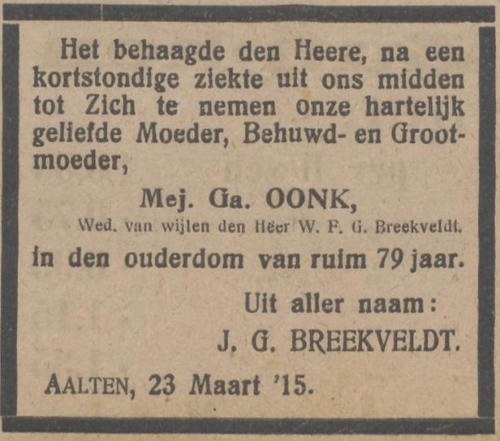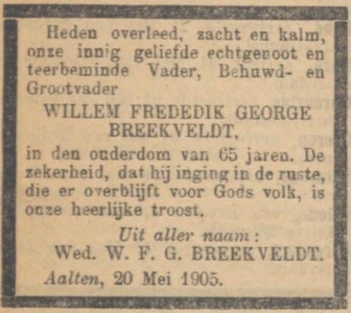 Gezinskaart:Willem Frederik George Breekveldt, * 1839, † 1905, zv. Jan Breekveldt & Gijsje Elsenaar.tr. 1e 1863: Garritdina Oonk, * 1835, † 1915, dv. Garrit Jan Oonk & Janna Haitink.Kinderen van Willem & Garritdina: 1. Johannes Gerhardus Breekveldt, * 1864, † 1942.2. Gerrit Breekveldt, * 1866, † 1889.3. Hendrik Breekveldt, * 1867, † 1951. 4. Gijsje Breekveldt, * 1870, † 1888.5. Johanna Breekveldt, * 1873, † 1940. 6. Mina Breekveldt, * 1876, † 1912.