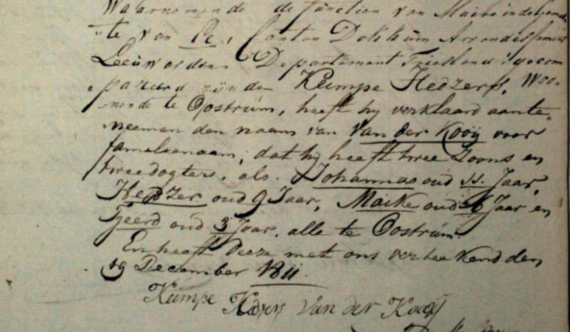 Gezinskaart:Keimpe Hedzers van der Kooi, * 1775, † 1828, zv. Hedzer Keimpes & Maaike Piebes (Pybes).tr. 1e 1799: Hiltje Tjeerds Straatsma, * 1778, † 1837, dv. Tjeerd Oenses Straatsma & Johantje Alberts Alberda.Kinderen van Keimpe & Hiltje: 1. Johanna Keimpes van der Kooi, * 1800, † 1874.2. Johannes van der Kooi, * 1800, † 1800.3. Hedzer Keimpes van der Kooi, * 1802, † 1877. 4. Maaike Keimpes van der Kooi, * 1805, † 1887. 5. Tjeerd Keimpes van der Kooi, * 1808, † 1847. 6. Tietje Keimpes van der Kooi, * 1812, † 1891. 7. Teetske van der Kooi, * 1816, † 1875. Naamsaanneming:Keimpe Hedzer: 19 december 1811: Keimpe Hedzer(s) van der Kooij (Kooi).Hiltje Oenzes: 12 maart 1812: Hiltje Tjeerds Straatsma.